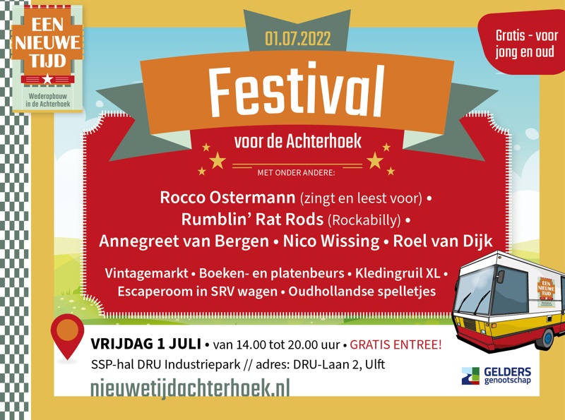 op 1 juli 2022 wordt in de SSP-hal bij de DRU in Ulft het gratis festival 'Een Nieuwe Tijd! gehouden. Dit is een afsluitende middag/avond van het project 'Een Nieuwe Tijd - Wederopbouw in de Achterhoek'.